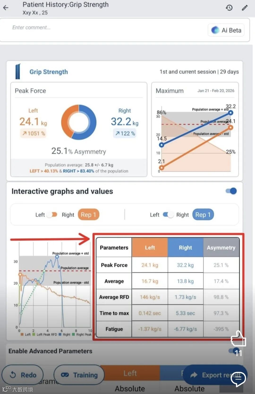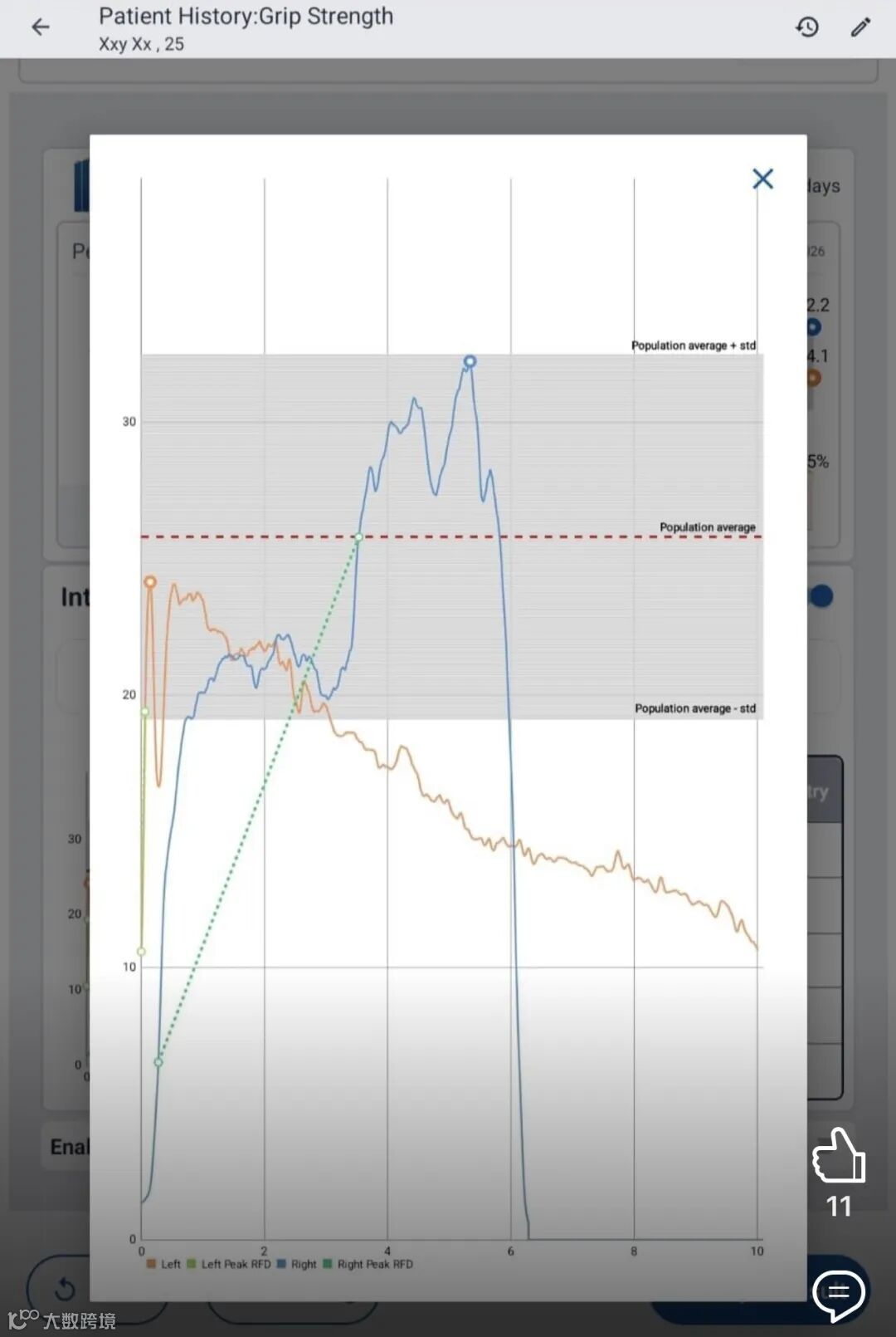 最近,在利用 Kinvent K-Grip 进行握力评估分析时,我们从一位患者左右手的**力-时间曲线(Force-Time Curve)**中发现了一些极具启发性的现象。