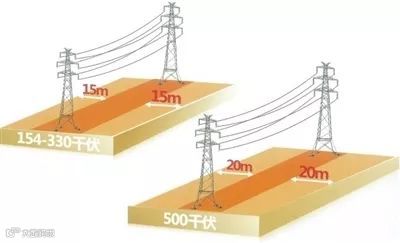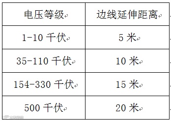 架空电力线路保护区:导线边线向外侧水平延伸并垂直于地面所形成的两平行面内的区域,在一般地区各级电压导线的边线延伸距离如下: