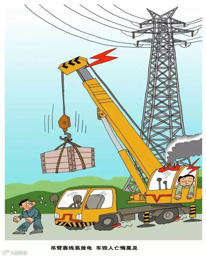 吊车吊臂吊运材料、铲车操作不小心,一碰到电线,触电!