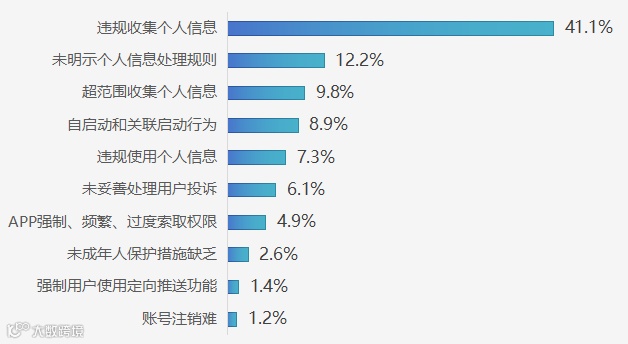根据2025年7月国家监管通报的数据,违规收集个人信息问题最多,未明示个人信息处理规则问题其次。App通报问题类型Top10的分布概览图如下所示: