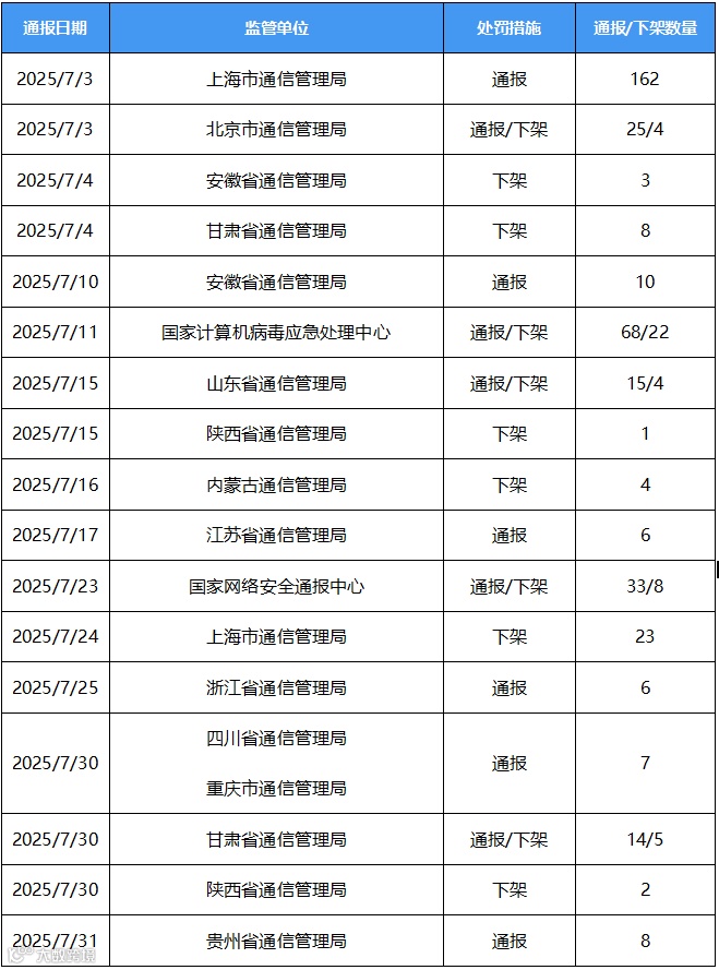 嘉佑安科监测到国家计算机病毒应急处理中心、国家网络安全通报中心各地通信管理局等13家监管公开通报/下架共计438款移动应用,详细数据见下表: