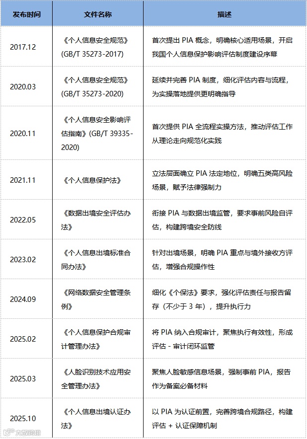 我国PIA制度历经十余年发展,从概念引入逐步走向法定化、场景化、闭环化。以下表格梳理了核心法规的发布脉络与核心贡献: