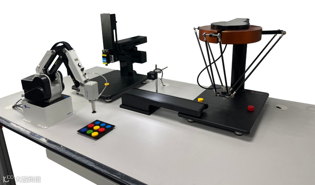 多场景智造单元--工件加工分拣系统开发实践平台包含并联机器人模块、直角坐标机器人模块、串联协作机器人模块、传送带、激光雕刻套件等;直角坐标机器人进行工件加工,串联机器人协作上下料;并联机器人在传送带快速拾取和分拣工件;完成工件加工分拣实践。