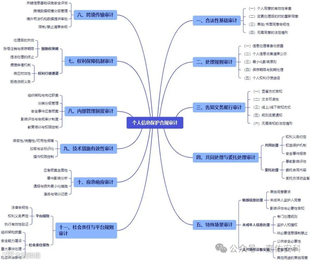 在《办法》的第六条中明确指出,自行开展或者按照监管要求委托专业机构开展合规审计的,应当参照本办法附件《个人信息保护合规审计指引》。审计指引中要求个人信息处理活动需确保合法性、透明性和安全性,重点审查特殊场景的单独授权与必要性评估,严格规范跨境数据传输的分级管理,建立便捷的权益保障机制和内部管理制度,并通过平台规则合规性验证及社会责任披露,最终形成26项审计内容,实现全流程合法合规、风险可控,切实保障个人信息主体的合法权益。整体归类如下图: