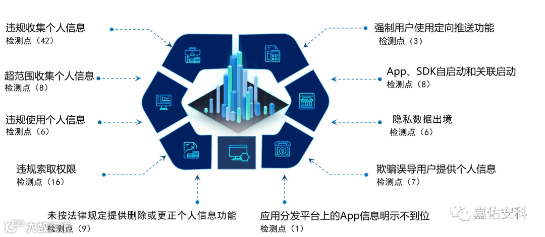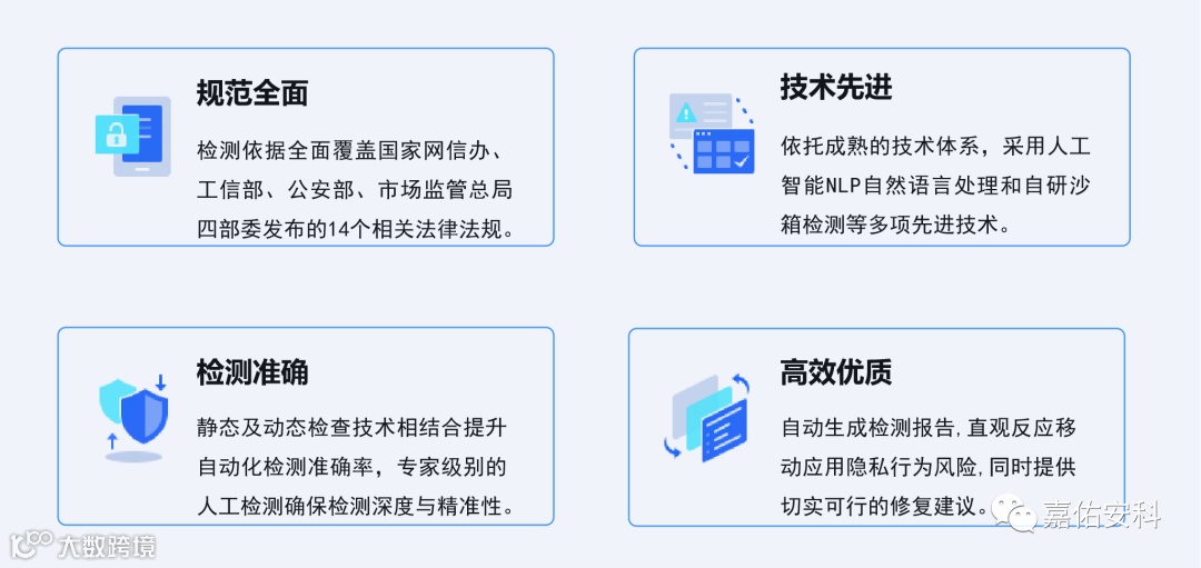 观澜是厦门嘉佑安科信息技术有限公司基于自身安全团队和产品研发团队,自主研发的一款面向监管部门和App厂商的移动应用隐私安全检测平台。平台以《网络安全法》、《个人信息保护法》为法律基座,以国家网信办、工信部、公安部、市场监管总局四部委发布的相关政策、法规、要求为检测依据,从违规收集/使用个人信息、超范围收集个人信息等10大维度出发,实现100余个隐私违规风险点的检测。全面覆盖当前App较为突出的各类隐私违规风险,和各主要监管部门关注的App隐私违规问题。通过自动化检测+专家级人工检测的方式,面向App运营者或开发者、应用市场和监管部门,提供全方位的App隐私安全检测服务。