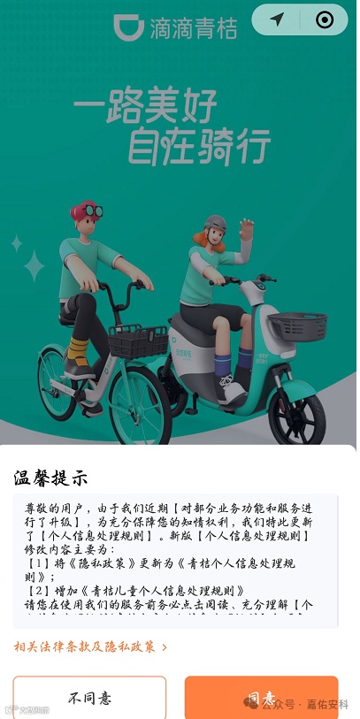 小程序向用户征求收集个人信息的同意环节,应提供明确的同意或拒绝选项,不应仅使用“好的”、“我知道了”等无法清晰表达用户同意的词语,不应设置为默认同意或采用默认勾选、缩小文字、冗长文本等方式诱导用户同意个人信息处理规则。