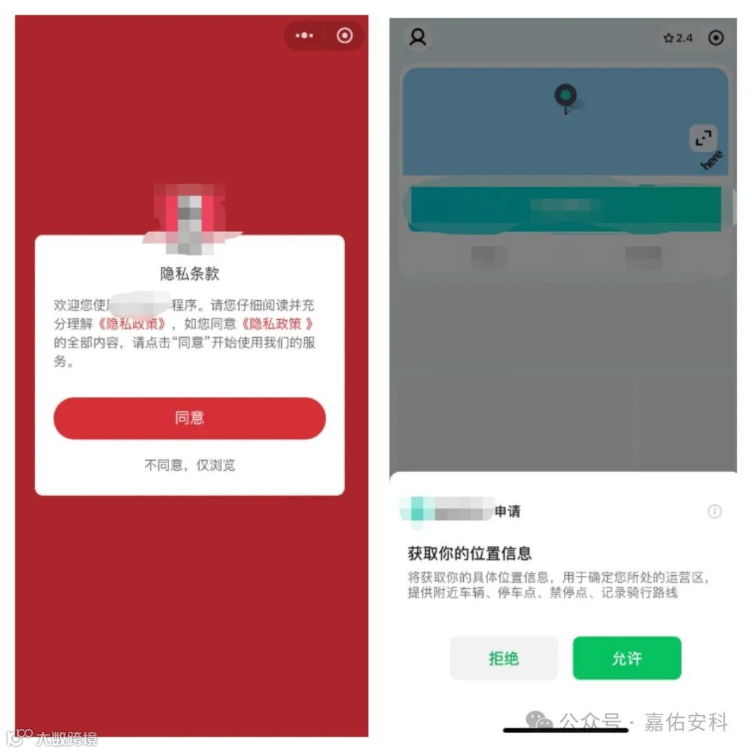 小程序在征求用户同意的环节,应提供明确同意和拒绝选项,如“同意”“拒绝,仅浏览”等意义明确的词汇;同时不应采用“登录即同意”“注册即同意”或者默认勾选等默认同意的方式诱导用户同意个人信息处理规则。示例如下: