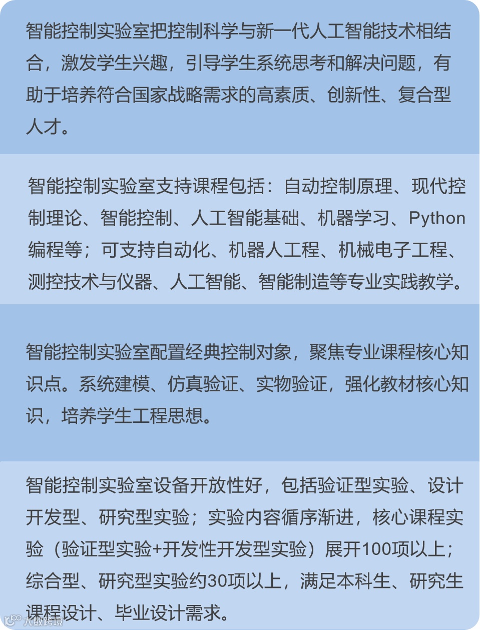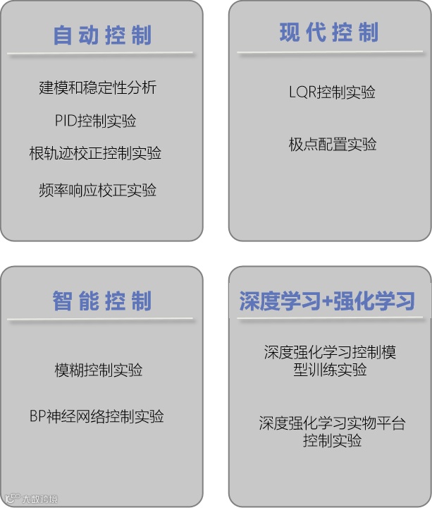 拟建设的智能控制实验室,要求实践教学设备不仅能够完成自动控制原理、现代控制理论、智能控制实验;同时也能够完成人工智能(深度学习+强化学习)实验,让控制科学教学与新一代人工智能技术紧密结合,激发学生兴趣,培养学生思考和系统解决问题能力,培养符合国家战略需求的高素质、创新性、复合型人才。