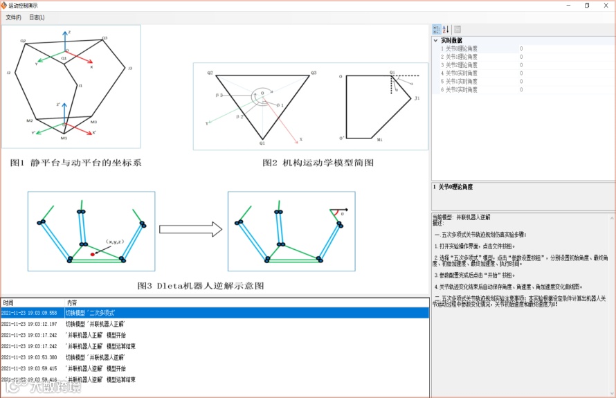 Delta 并联机器人是具有三个自由度,以并联方式驱动的一种闭环机构,在工业场合应用极为广泛。并联机器人由于其机构的特点,其优点呈现为无累积误差,精度较高、速度快、动态响应好。特别是无累积误差的优点,适合机器人运动学原理验证。公司自主研发的Delta并联机器人实验平台,包含机器人运动学、机器人轨迹规划、机器视觉等知识内容,同时也融入了机器人控制系统、视觉图像处理、人工智能等相关知识,提供完整的实验指导书及相关案例,特别适合机器人工程相关专业开展核心课程本科教学实验及工程实践研究,是兼顾教学与科研的理想实验平台。