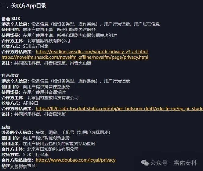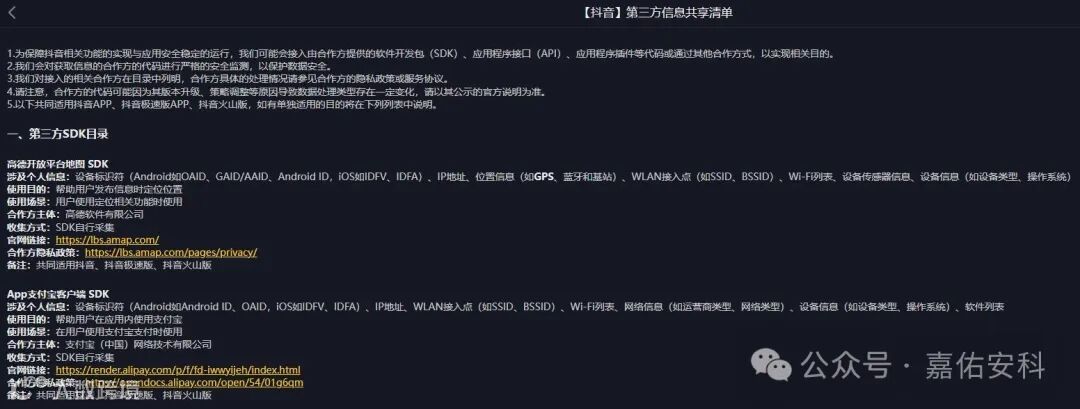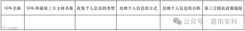 一般在隐私政策末尾附上第三方信息共享清单、在共享模块展示或者在隐私政策中附上第三方信息共享(SDK)清单链接。内容结构一般根据标准目录内容罗列(如下图)