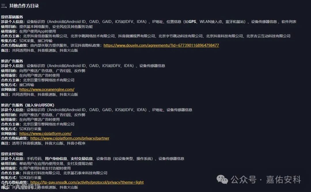 同时,第三方信息共享清单根据共享方式呈现,可能是第三方合作商、第三方SDK等。