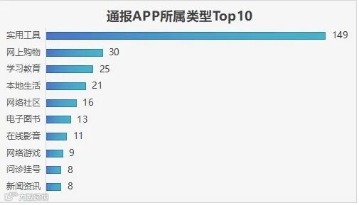 根据2025年5月国家监管机构的最新通报数据,“实用工具类”以 149 款居首,数量远超其他,整体呈现实用工具类占比突出的分布特点。App通报应用类型Top10的分布概览图如下所示: