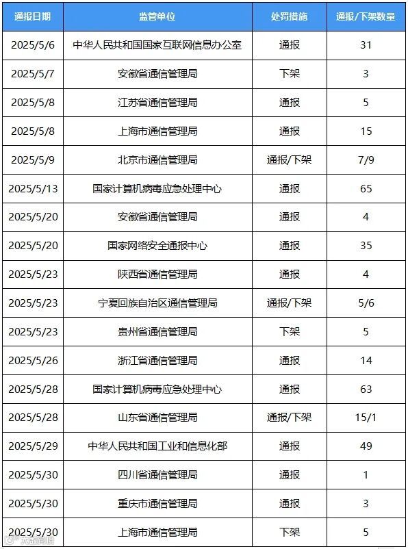 嘉佑安科监测到中华人民共和国工业和信息化部、中华人民共和国国家互联网信息办公室、国家计算机病毒应急处理中心、国家网络安全通报中心各地通信管理局等13家监管公开通报/下架共计345款移动应用,详细数据见下表: