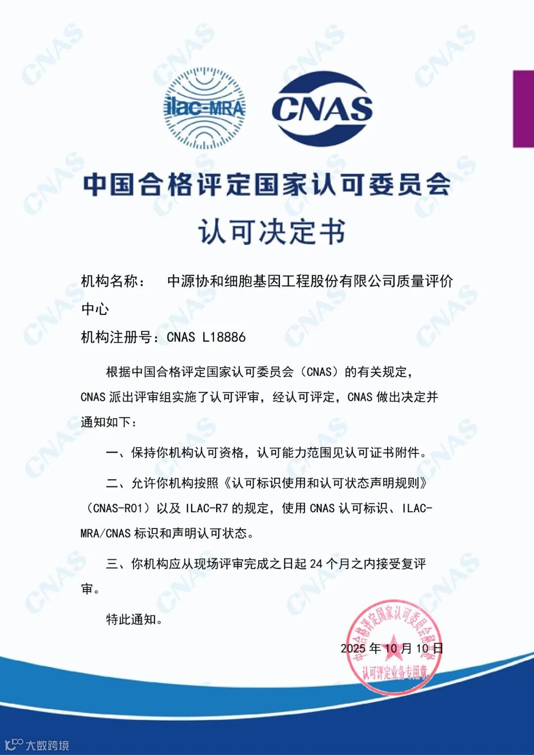 近日,中源协和细胞基因工程股份有限公司质量评价中心顺利通过中国合格评定国家认可委员会(CNAS)复评审并正式收到认可决定书,这标志着该公司实验室管理体系与细胞类生物制品领域检测技术再度获国际权威认可,检测数据将继续实现全球互认,为公司细胞药物研发及申报提供有力支撑,同时为提升品牌公信力与市场竞争力注入核心动力。