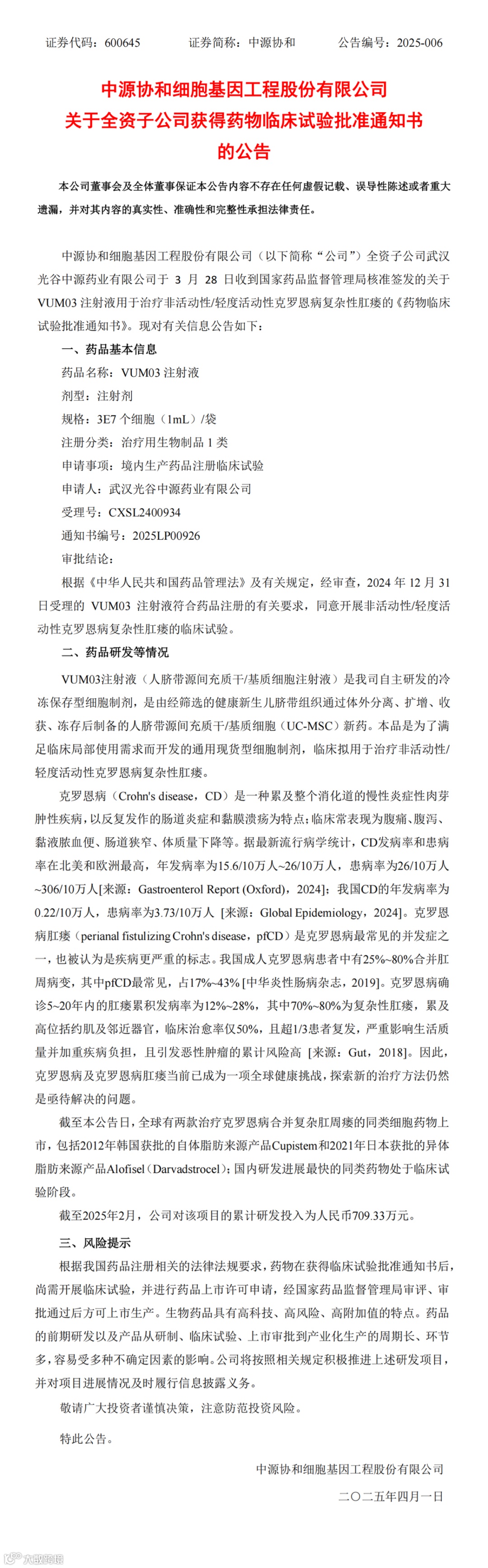 中源协和细胞基因工程股份有限公司(以下简称“公司”)全资子公司武汉光谷中源药业有限公司于3月28日收到国家药品监督管理局核准签发的关于VUM03注射液用于治疗非活动性/轻度活动性克罗恩病复杂性肛瘘的《药物临床试验批准通知书》。现对有关信息公告如下: