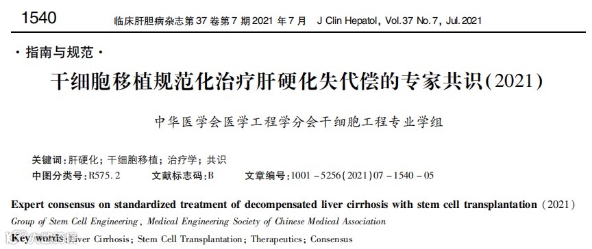 [4]韩英,郭长存,时永全.干细胞移植规范化治疗肝硬化失代偿的专家共识(2021)[J].临床肝胆病杂志,2021,37(07):1540-1544.