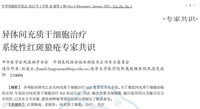 [2]梁军,王丹丹,耿林玉等.异体间充质干细胞治疗系统性红斑狼疮专家共识[J].中华风湿病学杂志,2022,26(01):1-8.