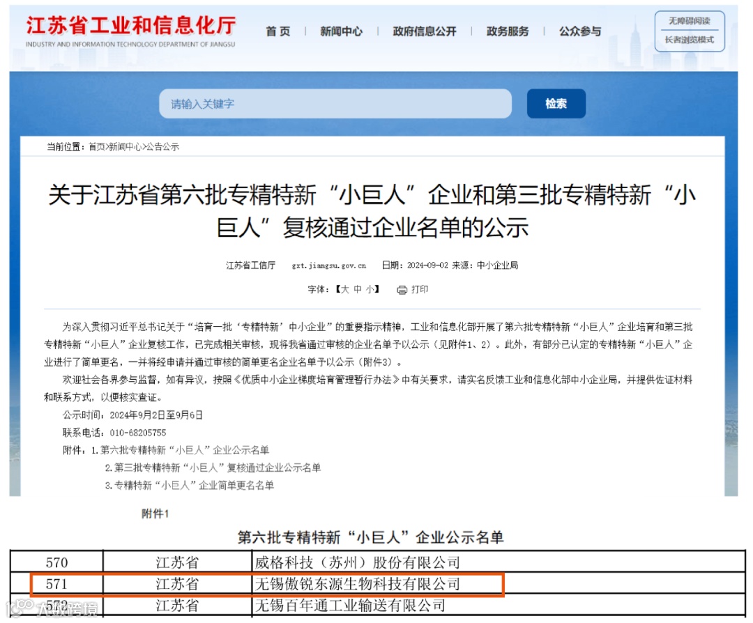 近日,江苏省工业和信息化厅公布了《关于江苏省第六批专精特新“小巨人”企业和第三批专精特新“小巨人”复核通过企业名单的公示》,中源协和旗下的无锡傲锐东源生物科技有限公司获得国家级专精特新“小巨人”企业称号,在技术创新、市场竞争力和行业影响力方面再获国家级的高度认可和肯定。