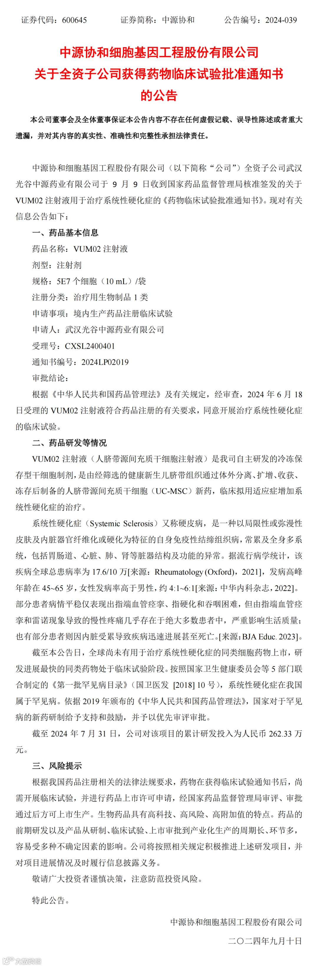 中源协和细胞基因工程股份有限公司(以下简称“公司”)全资子公司武汉光谷中源药业有限公司于 9 月 9 日收到国家药品监督管理局核准签发的关于VUM02 注射液用于治疗系统性硬化症的《药物临床试验批准通知书》。现对有关信息公告如下: