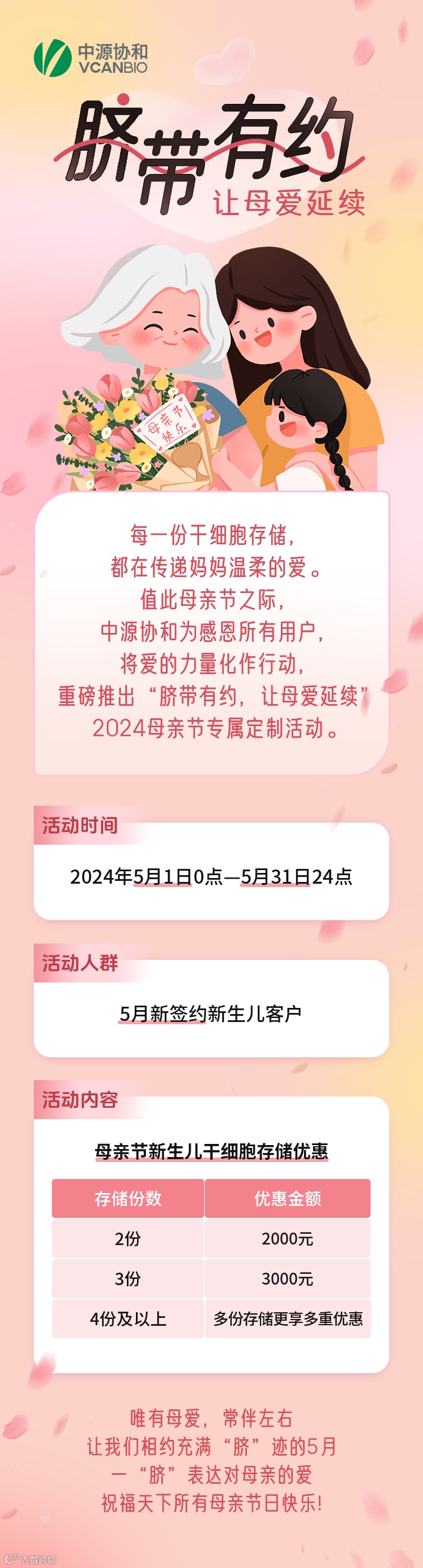对于世界上最伟大的妈妈来说,爱,是最好的礼物。值此母亲节即将来临之际,中源协和为感恩所有用户的支持与信任,重磅推出“脐带有约,让母爱延续”母亲节专属定制活动。