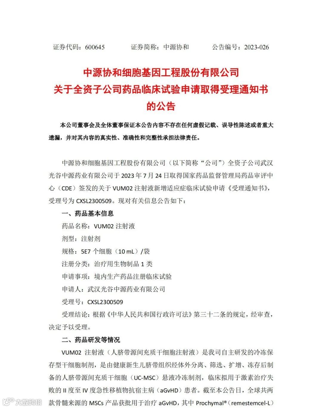 中源协和细胞基因工程股份有限公司(以下简称“公司”) 全资子公司武汉光谷中源药业有限公司于 2023 年 7 月 24 日取得国家药品监督管理局药品审评中心(CDE)签发的关于 VUM02 注射液新增适应症临床试验申请《受理通知书》,受理号为 CXSL2300509 。现对有关信息公告如下:
