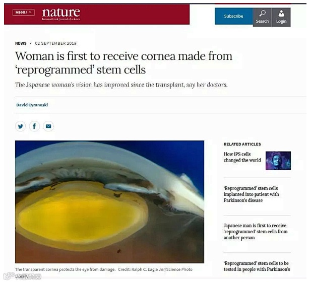 2019年8月,来自日本大阪大学的眼科专家Kohji Nishida为一名女性实施了重编程干细胞制成的角膜移植手术,这名患者患有一种疾病使其眼睛中修复角膜的干细胞发生了丢失,会带来视力模糊、甚至失明等问题。Nishida和他的团队对这位患有角膜疾病的女性进行了角膜移植手术。用于移植的是诱导多能干细胞(IPSCs),这些干细胞取自成体供体,重编程为未分化状态,然后诱导形成角膜干细胞。Nishida表示,这名女性在接受移植手术后眼睛中的角膜依然清晰,而且视力也有所改善。
