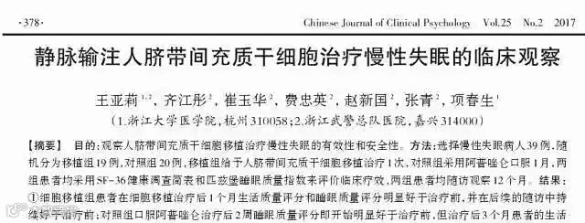 2017年,发表在《中国临床心理学》杂志的一项临床观察成果显示,浙江大学医学院和浙江武警总队医院的医生们通过静脉输注脐带间充质干细胞可长期改善慢性失眠患者的睡眠质量。