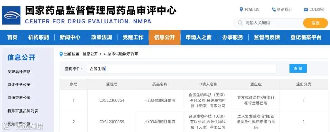 2023年 4 月18日,致力于成为全球领先的细胞基因前沿创新技术驱动的生物制药企业合源生物科技(天津)有限公司(以下简称“合源生物”)宣布公司双靶点CAR-T细胞治疗产品(HY004细胞注射液)的两项新药临床试验申请已获国家药品监督管理局(NMPA)默示许可,适应症分别为:治疗成人复发或难治性B细胞型急性淋巴细胞白血病(r/r B-ALL)(受理号:CXSL2300055)和治疗复发或难治性B细胞非霍奇金淋巴瘤(r/r NHL)(受理号:CXSL2300054)。