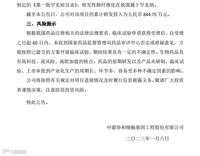 中源协和细胞基因工程股份有限公司(以下简称“公司”)全资子公司武汉光谷中源药业有限公司于 2023 年 1 月 5 日取得国家药品监督管理局药品审评中心(CDE)签发的关于 VUM02 注射液临床试验申请《受理通知书》,受理号为CXSL2300006 国。现对有关信息公告如下: