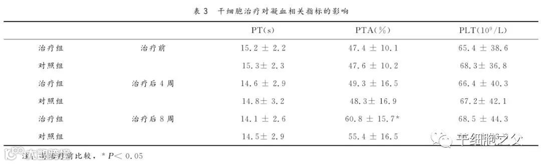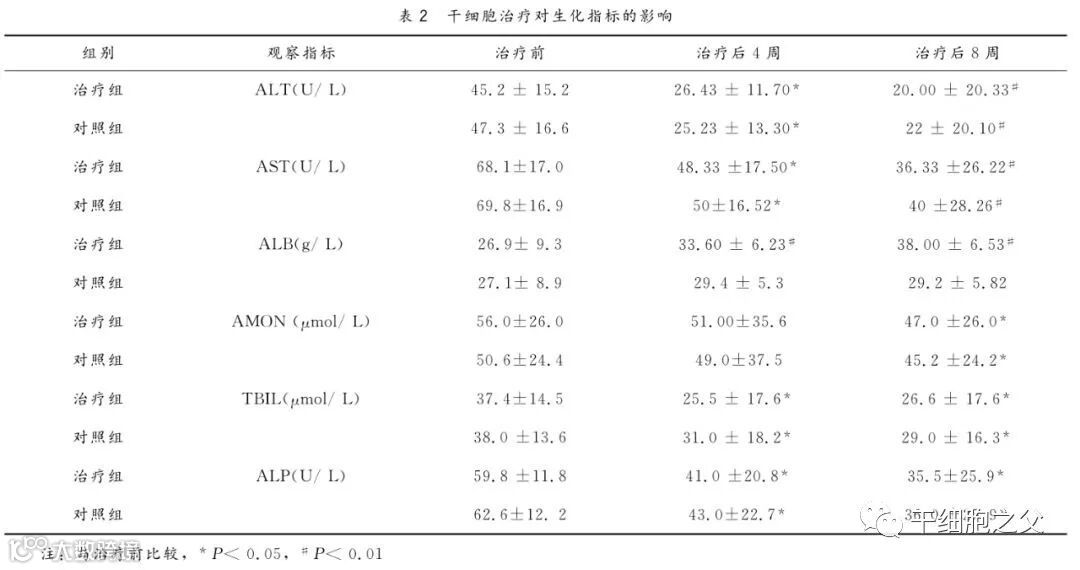 外周静脉输入干细胞2×107个,观察患者移植后第0、4、8周的临床疗效及术后的不良反应。治疗组和对照组乏力、纳差、尿少、水肿症状在第1~2周即明显缓解,腹胀明显减轻,2~8周症状持续缓解。治疗组8周后肝功能合成指标(ALB、PTA)较治疗前均有显著改善,而对照组治疗前后比较则无显著性差异。