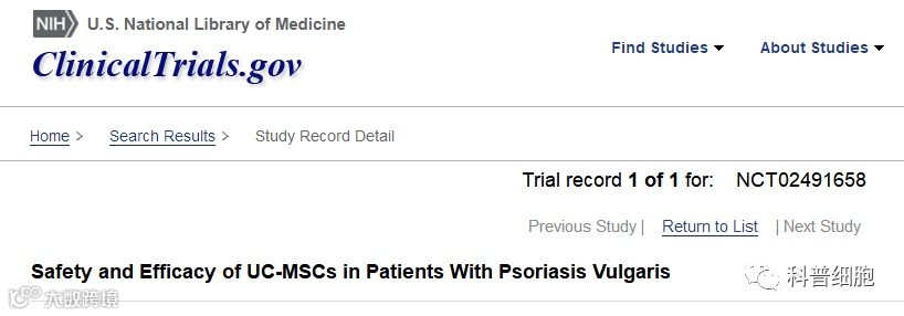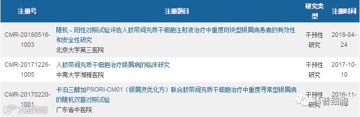 中国学者在ClinicalTrials注册的临床试验:脐带间充质干细胞治疗寻常型银屑病的安全性和有效性。