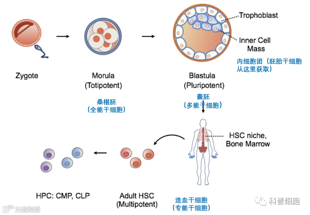 干细胞(SC),是人体的起源细胞,有自我复制和多向分化的潜能。依据SC所处的发育阶段将干细胞分为成体干细胞(ASC)和胚胎干细胞(ES)。