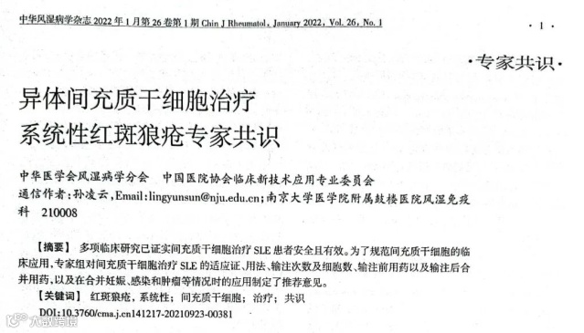2022年开局,又添一项干细胞治疗的专家共识!《异体间充质干细胞治疗系统性红斑狼疮专家共识》发表在2022年1月第26卷第1期的《中华风湿病学》杂志上。