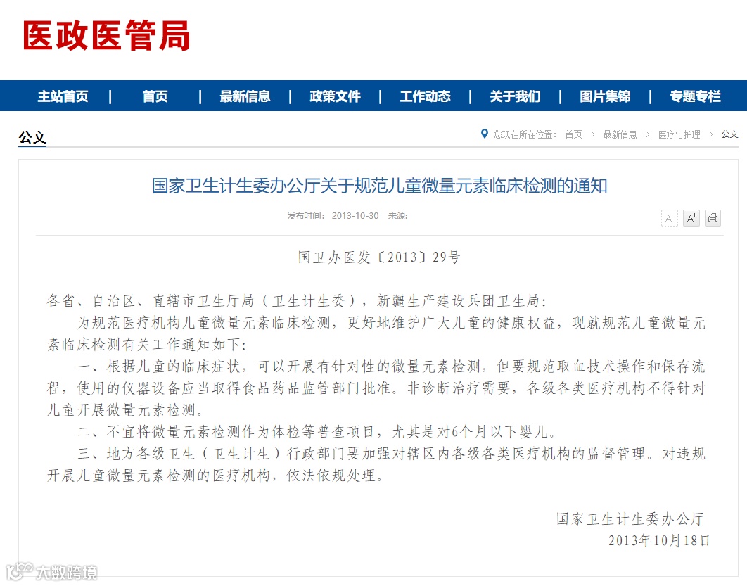 2013年《关于规范儿童微量元素临床检测的通知》,明确指出“非诊断治疗需要不得针对儿童开展微量元素检测,不宜将微量元素作为体检等普查项目,尤其是对6个月以下婴儿。”6个月以下的宝宝本身血液量较少,通过抽血做检查会让宝宝很痛苦。而对于有一些药店、母婴店为了吸引顾客,提供免费的微量元素检测,用的“夹手指”检测方法,就更加不可信了。2021年8月,国家卫健委印发通知,强调非诊断治疗需要不得针对儿童开展微量元素检测,不得将微量元素检测作为儿童体检项目。