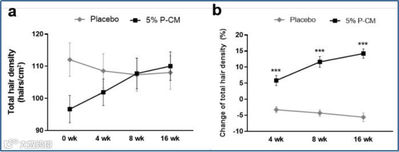 那么实际效果如何呢?共有30例轻度至中度脱发的患者完成了为期16周的研究(P-CM组=16,安慰剂组=14)。每日头皮涂抹两次(1-2mL/次),1- 2min后按摩头皮至吸收。