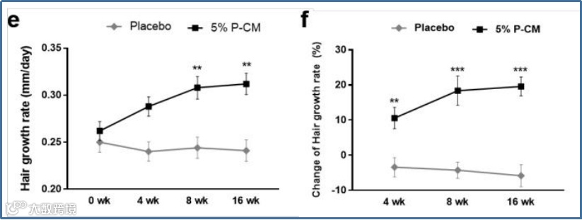 在16周的研究期间,P-CM组的平均头发生长速率从0.262±0.039增加到0.312±0.045mm/天,这增加了19.54%。安慰剂组的头发生长速度从治疗前0.257±0.039mm/天下降到16周后的 0.241±0.043mm/天 。与安慰剂组相比,P-CM组的毛发生长速度的增加有统计学意义 (p<0.001)(图5e,f)。
