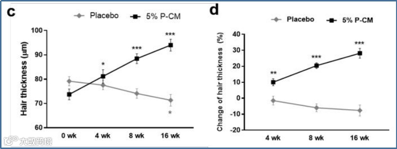 P-CM组的平均毛发厚度从0.074±0.009mm增加到0.094±0.010mm,增长了28.19%。相反,安慰剂组的头发厚度为治疗前0.078±0.007mm,16周后降为0.071±0.009mm。在16周时,试验组较安慰剂组的毛发厚度增加有统计学意义(p<0.001)(图5c、d)。