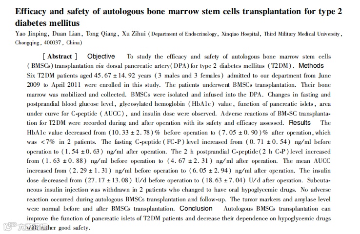 推荐阅读:22例T2DM应用研究,干细胞移植显著降低糖化血红蛋白水平,改善患者C肽水平