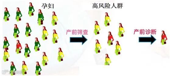 产前筛查:通过简便、经济、较少创伤的方法,从孕妇人群中发现有先天性缺陷和遗传性疾病胎儿的高风险孕妇,以便进一步明确诊断。筛查方法包括唐筛、无创DNA、影像学方法等。