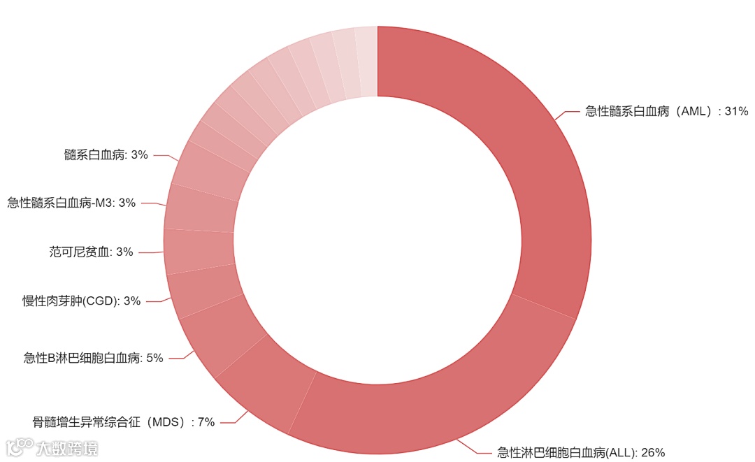 涉及的应用范围包括:白血病、慢粒急变期、再生障碍性贫血、阵发性睡眠性血红蛋白尿症、骨髓增生异常综合征、范可尼贫血、慢性肉芽肿、地中海贫血等。