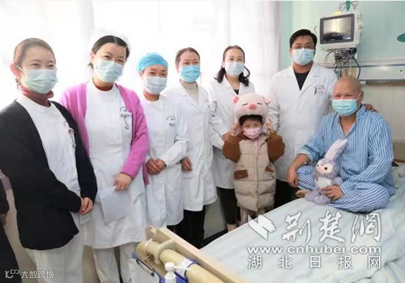 12月20日,进入移植仓前,血液内科主任周芙玲、护士长李建芳专门带她去探望胡先生,让“大体重”给“小病号”鼓劲:“瑶瑶要加油,我把好运传递给你,你也能成功康复!”