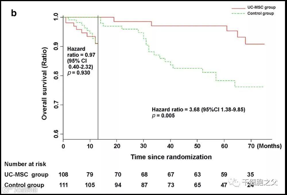 通过Landmark分析,在13个月至75个月的随访期间,脐带间充质干细胞治疗组的总生存率明显高于对照组。