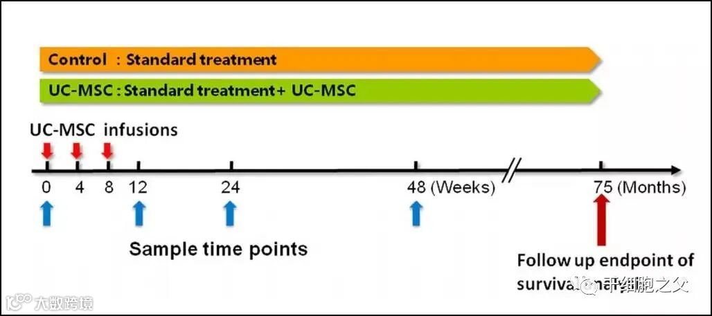 治疗组患者在0周、4周、8周给予UC-MSC输注三次。分别于治疗后0、12、24、48周进行临床参数测定。为了进行生存分析,随访延长至75个月。