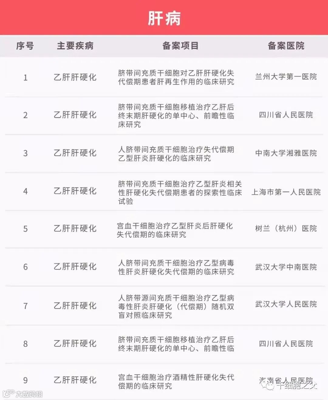 目前有9项经卫健委备案的干细胞治疗肝硬化的临床研究项目,均采用间充质干细胞,其中7项是脐带来源的间充质干细胞;