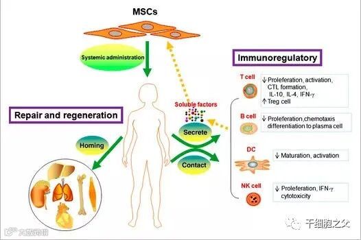 4、MSC和B细胞的作用机制类似于T细胞,还通过信息接触作用和分泌可溶性因子起作用。据报道,MSC通过PD-1/ PD-L1与B细胞的直接接触来抑制其功能。