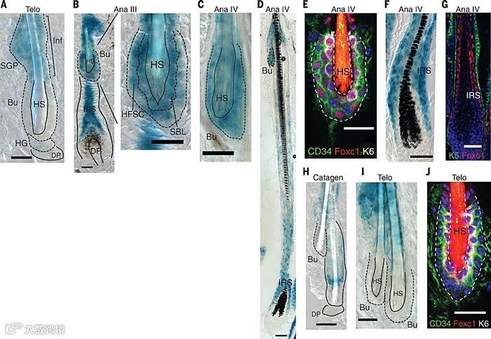 一般而言,所有毛囊在小鼠出生时就已开始发育,但是毛囊峡部微环境在出生后3周仍不显著,而此时小鼠已经具有完整的毛发覆盖。因此,毛囊干细胞从何而来,如何形成微结构尚不清楚。毛囊来自于表皮,而不是峡部微环境。
