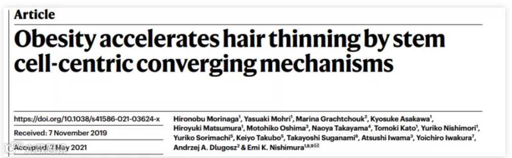2021年6月23日,日本东京医科与齿科大学西村栄美(Emi K. Nishimura)教授课题组在Nature 发表了题为“Obesity accelerates hair thinning by stem cell-centric converging mechanisms”的研究长文,发现肥胖导致代谢紊乱,能激活毛囊干细胞内炎症信号以及ROS与脂类的异常积累,进而诱发毛囊干细胞耗竭,最终导致毛发减少。