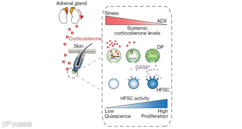 研究者发现与压力相关的激素(皮质酮)通过调节毛囊的休止期影响毛发的生长。在长期的慢性压力下,皮质酮的水平升高,延长毛囊的休止期的长度,使得毛囊干细胞长期处于静息状态。但是在移除皮质酮后,会促进毛囊干细胞进入到再生周期之中。