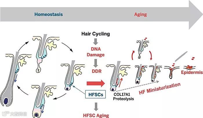 东京医科齿科大学Hiroyuki Matsumura等人称,脱发是由DNA损伤诱导的COL17A1蛋白水解引起的。在毛发周期中毛囊干细胞如果收到“衰老”刺激,它们将完成自己的“生命”周期,并最终分化为表皮角质,然后从皮肤表面清除。