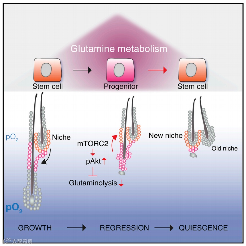 他们发现:毛囊干细胞可以通过响应组织中的低氧浓度而切换其代谢状态(由谷氨酰胺代谢转变为糖酵解代谢),增强外根鞘祖细胞向毛囊干细胞转化,减少毛囊干细胞的消耗。